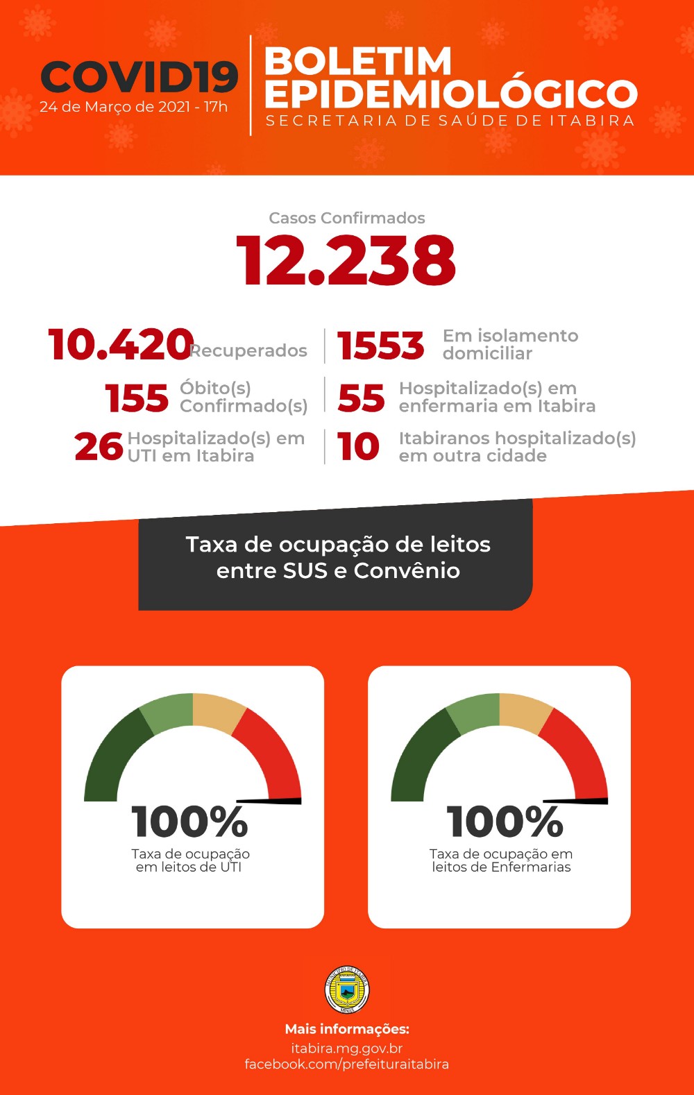 Nenhum leito de UTI para pacientes com covid-19 está disponível em Itabira, a situação de colapso é registrada em boletim divulgado pela prefeitura na noite desta quarta-feira (24): só no mês de março foram 76 mortes pela doença, só hoje foram confirmados 12 óbitos com coronavírus; totalizando 155 óbitos pela doença no município.