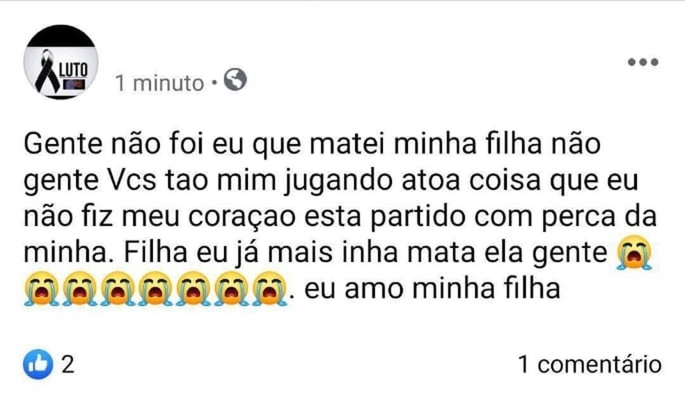 “Gente não foi eu que matei minha filha não gente. Vcs tão mim jugando atoa coisa que eu não fiz meu coraçao esta partido com perca da minha filha. Eu já mais inha mata ela gente. Eu amo minha filha (sic)”, disse a suspeita.