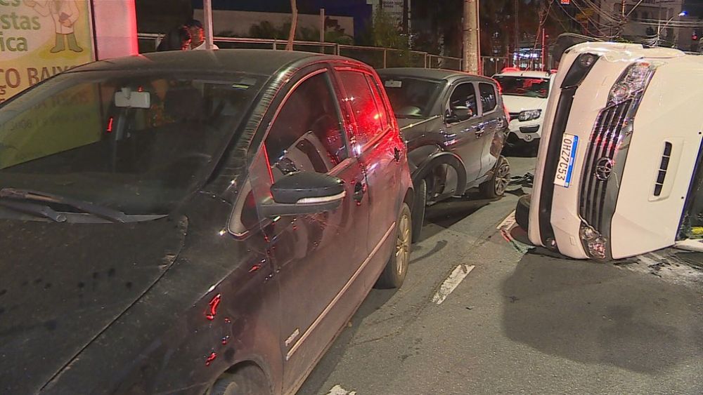 O carro que ele dirigia bateu em outros três que estavam estacionados e capotou. Ninguém se feriu.