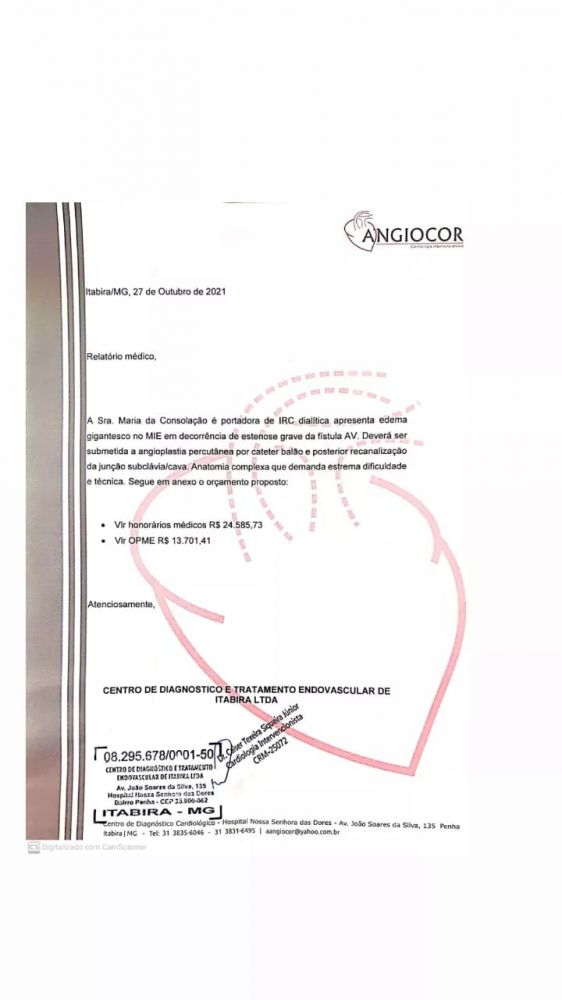 A santa-mariense Maria da Consolação da Cruz “Ná de Sr Moreira”, teve um novo relatório médico, emitido na última quarta-feira (27) pelo Centro de Diagnóstico e Tratamento Endovascular de Itabira (CDTE). "Ná de Sr Moreira" é ex-funcionária do (HPE) Hospital Padre Estevem de Santa Maria de Itabira. O procedimento cirúrgico precisa ser realizado com urgência e qualquer quantia doada será importante neste momento. A ajuda poder ser feita por meio de PIX, CPF: 027.242.726-84.