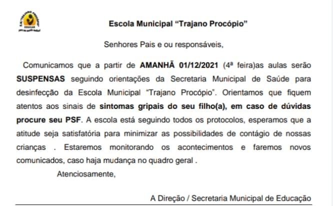 "Comunicamos que a partir de 01/12/2021 (4ªfeira) as aulas serão SUSPENSAS seguindo orientações da Secretaria Municipal de Saúde para desinfecção da Escola Municipal "Trajano Procópio". Orientamos que fiquem atentos aos sinais de sintomas gripais de seu filho(a), em caso de dúvidas procure o seu PSF. A escola está seguindo todos os protocolos, esperamos que a atitude seja satisfatória para minimizar as possibilidades de contágio de nossas crianças. Estaremos monitorando os acontecimentos e faremos novos comunicados, caso haja mudança no quadro geral.