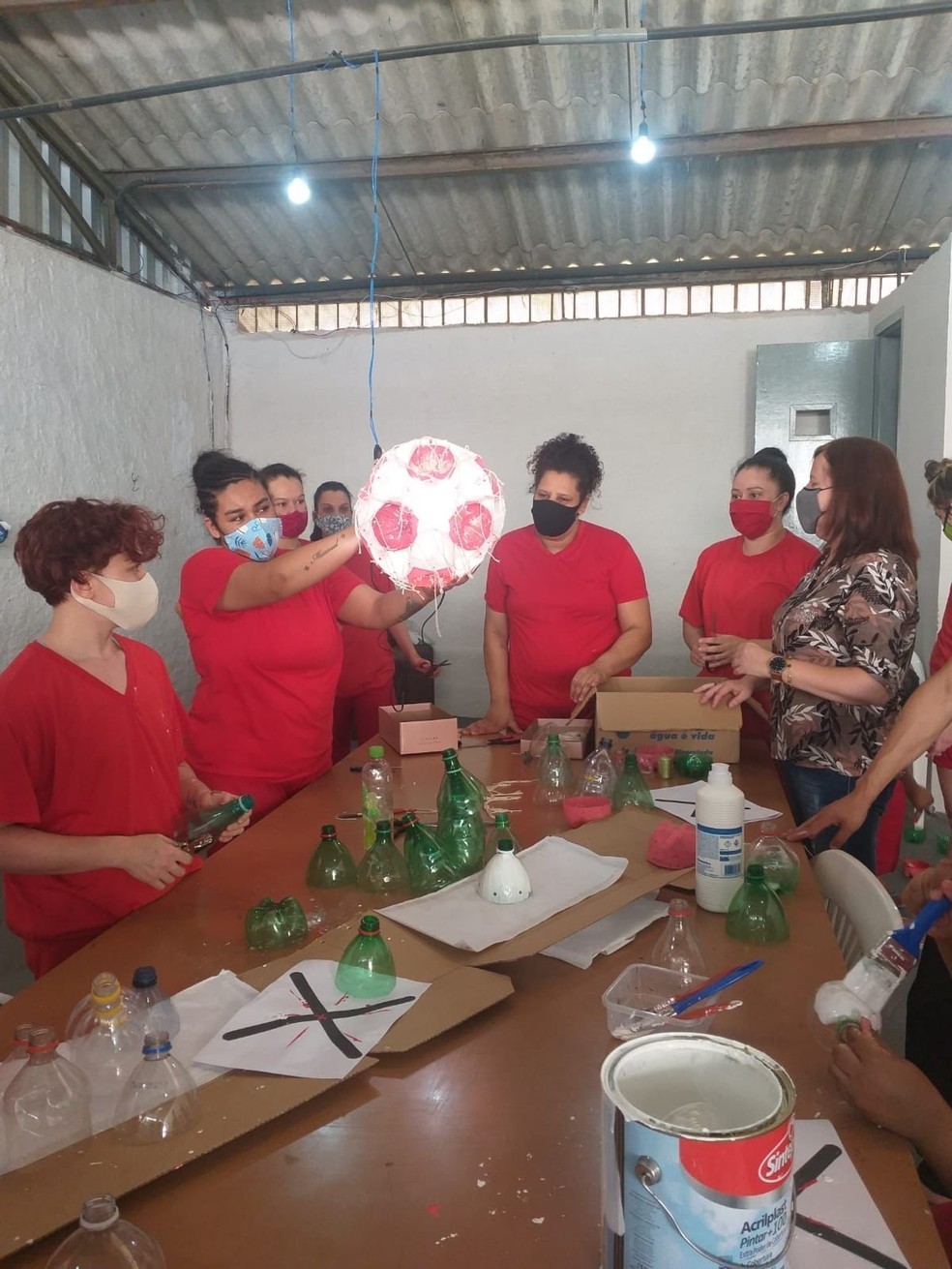 Dentro das bolas serão colocadas lâmpadas para o efeito luminoso. Além disso, as presas também trabalham na produção de sinos e fitas com os recicláveis. Já as cápsulas de café serão usadas para as decorações menores.