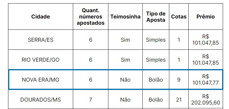 Na faixa de cinco acertos, a chamada quina da Mega, 16 apostas foram contempladas com, no mínimo, R$ 101.047,85. Entre essas apostas está uma de Nova Era, cidade localizada a leste da capital de Minas Gerais.