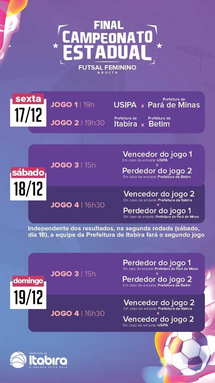 15h – Vencedor do Jogo 1 (em caso de empate, Usipa/ Liespe/ Ipatinga) x Perdedor do Jogo 2 (em caso de empate, Prefeitura de Betim)