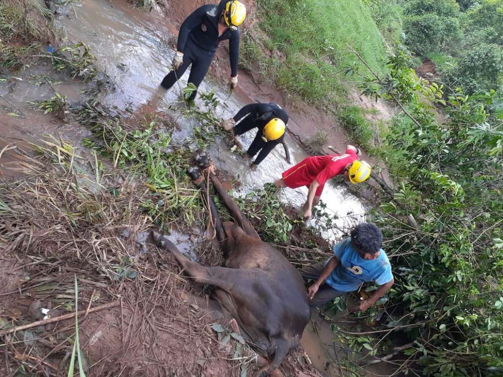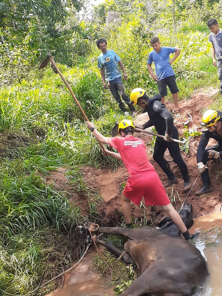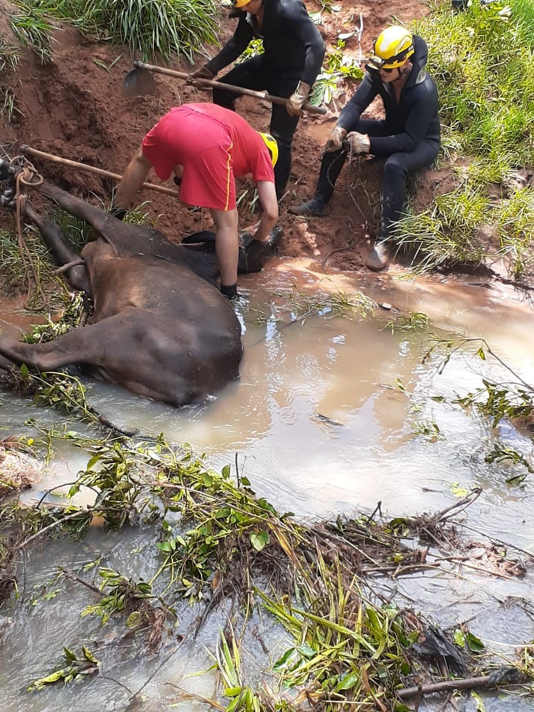 Na manhã da sexta (17), o 2º Pelotão de Bombeiros Militar foi acionado para resgatar uma vaca que estava atolada no Córrego Sujo, bairro Santa Edwiges, em Ituiutaba (MG).