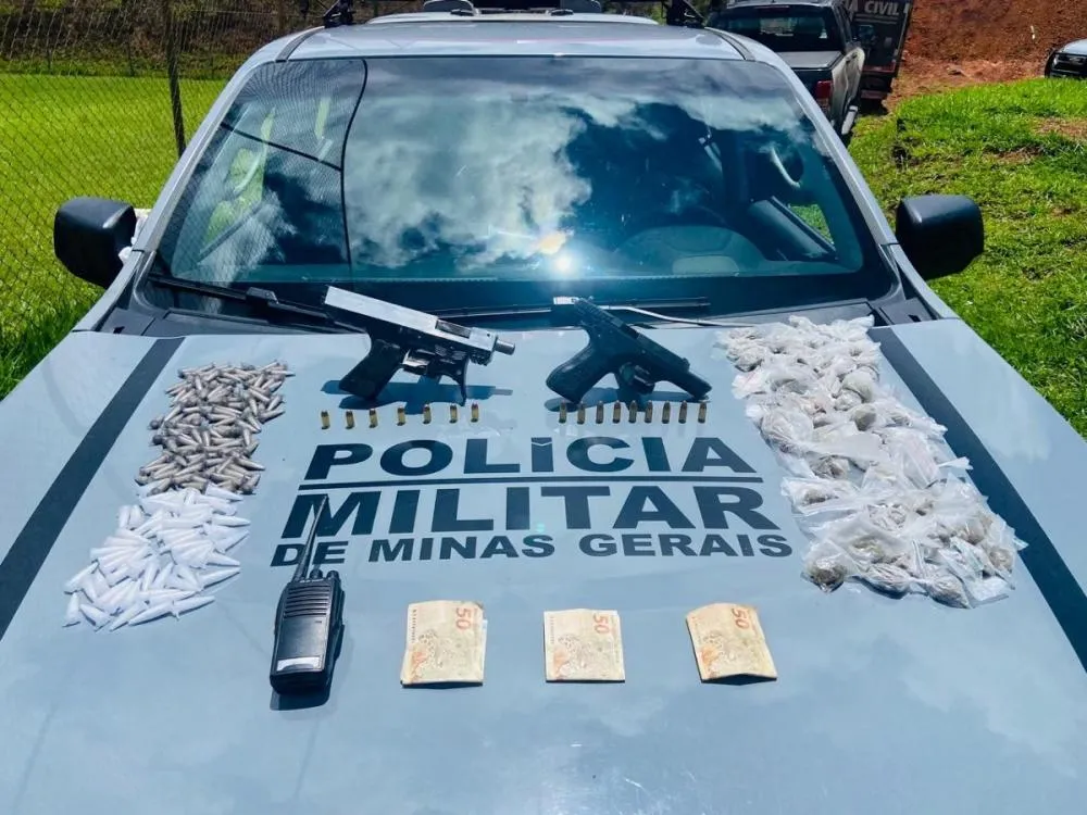 Suspeitos foram localizados em uma área de mata e presos; drogas e armas de fogo também foram apreendidas