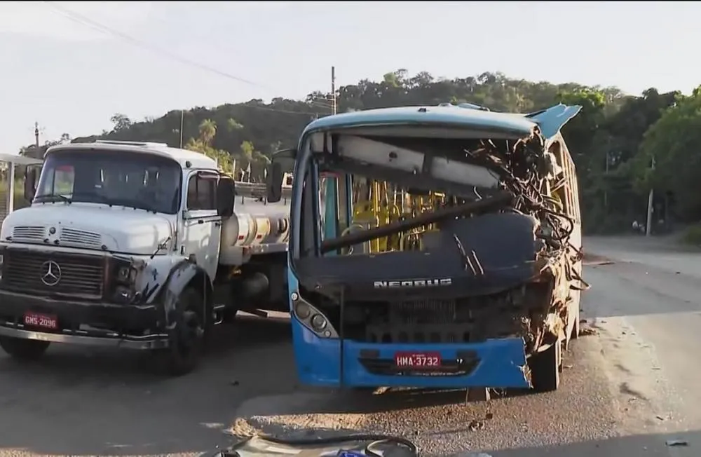 Batida envolveu coletivo com 26 passageiros e uma motocicleta com queixa de furto; rodovia ficou interditada por quatro horas
