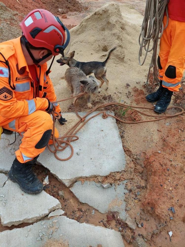 Bombeiro desce de rapel em um barranco e socorre cães em Sabará (MG)