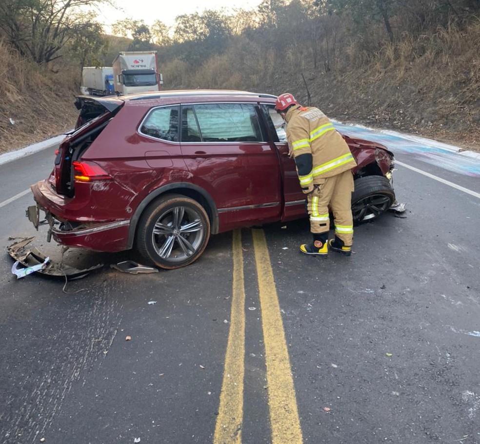 Segundo os bombeiros, caminhão perdeu os freios em uma descida e bateu na lateral do carro. Vítimas foram socorridas com ferimentos leves.