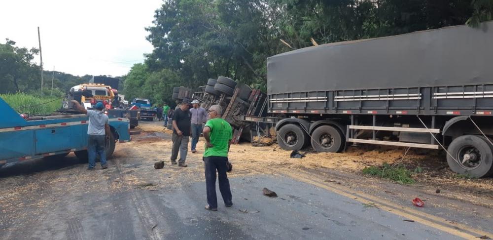 Veículo estava com carga de milho e cabine foi esmagada durante acidente