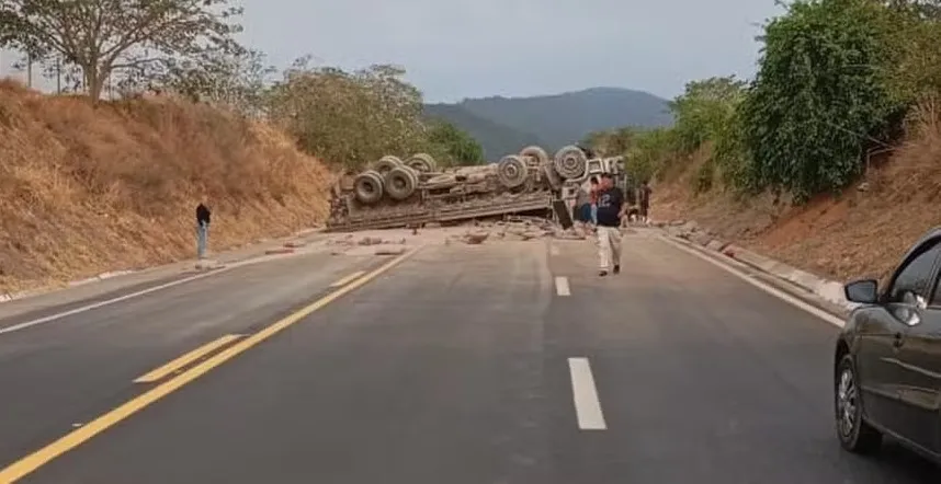 Caminhão que transportava cimento tomba na BR-262, em São Domingos do Prata