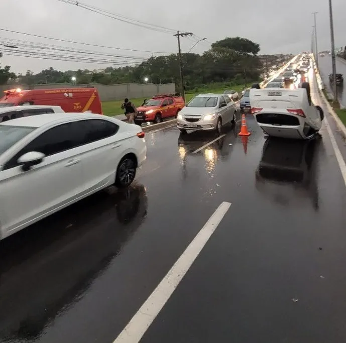 De acordo com o Corpo de Bombeiros, após a parada brusca de um veículo que estava na frente ocorreu uma colisão traseira e, em seguida, o capotamento