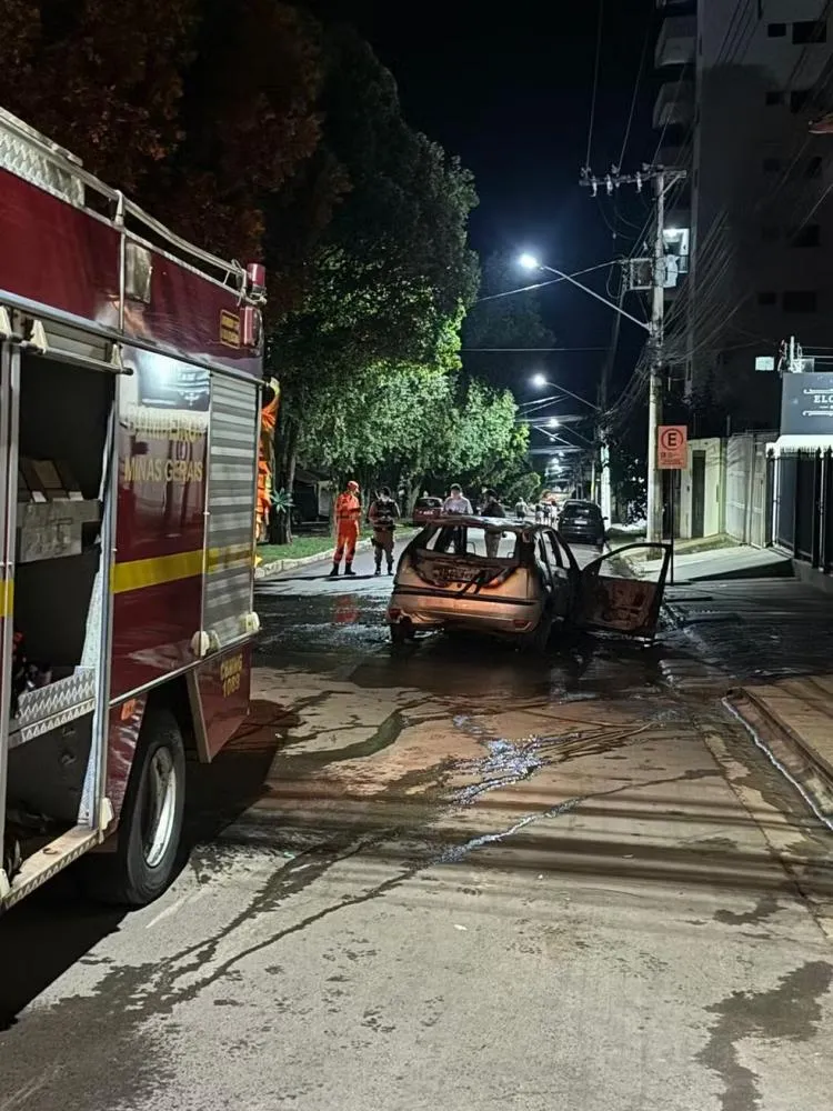 Carro fica totalmente destruído depois de pegar fogo em avenida de Unaí